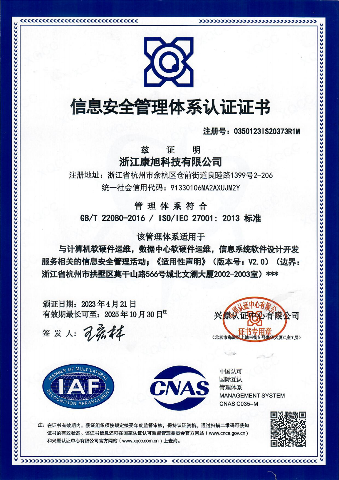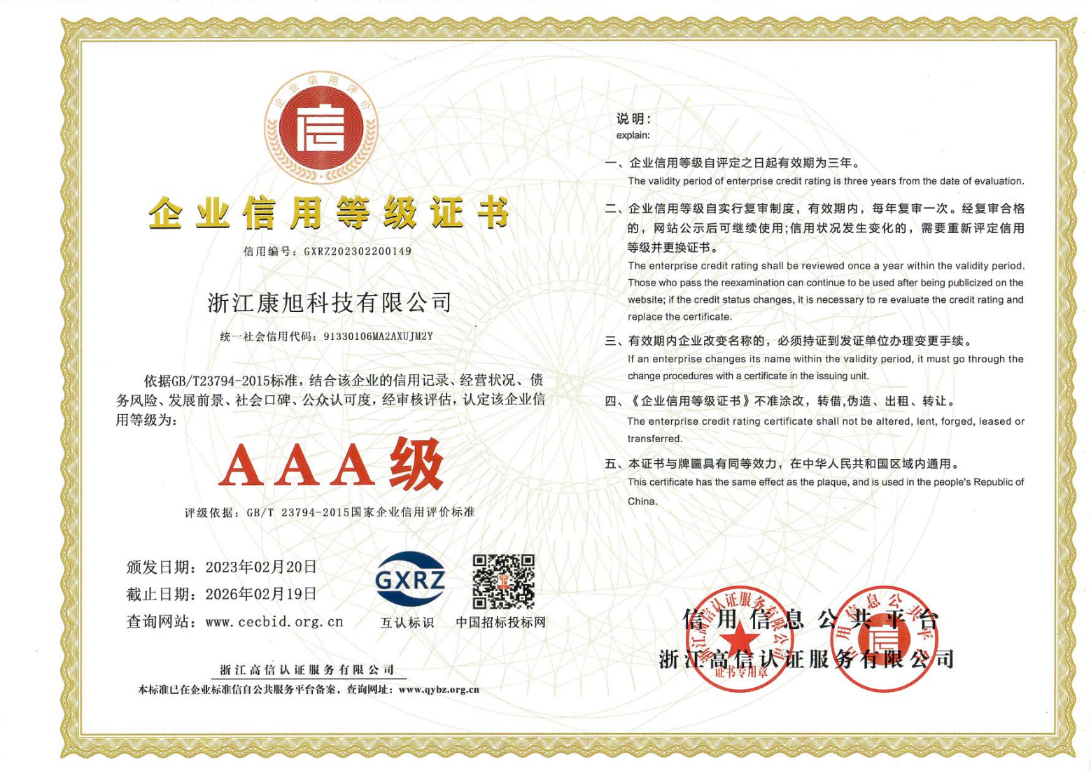 浙江康旭AAA信用等級